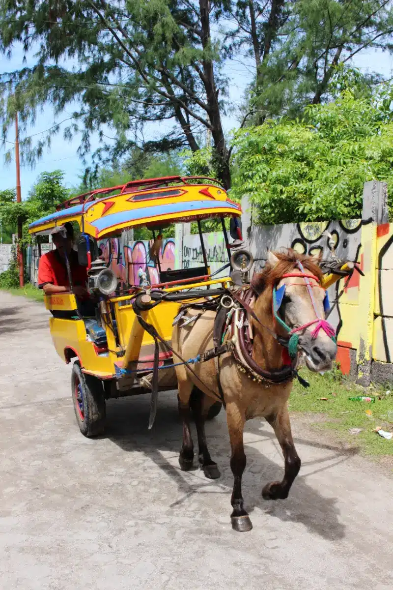 Sur ces îles, il n’y a ni voitures ni scooters : tout se fait à pied, à vélo ou à bord d’un Cidomo, une petite charrette tirée par des chevaux. En moins d’une heure, vous pouvez en faire le tour, tout en profitant de la douceur de vivre propre aux Gili.