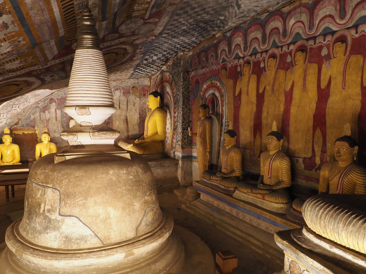 Les cinq grottes principales, véritablement sculptées dans la montagne, sont richement ornées de peintures murales et de statues. On n’y découvre pas moins de 157 représentations du Bouddha, accompagnées de divinités hindoues comme Vishnu et Ganesh, ainsi que de figures royales issues de l’histoire sri-lankaise. Parmi elles, une statue impressionnante du Bouddha couché, longue de 15 mètres, attire immédiatement le regard.