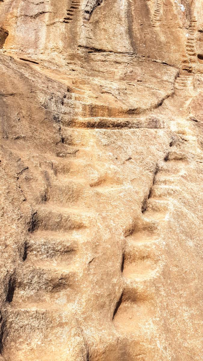 L’entrée principale, autrefois spectaculaire, se faisait par une immense gueule de lion sculptée dans la roche. Aujourd’hui, seules les pattes colossales subsistent, témoin silencieux de ce passage légendaire. Le lion, figure centrale du site, symbolisait la force, la domination et la protection du souverain.
